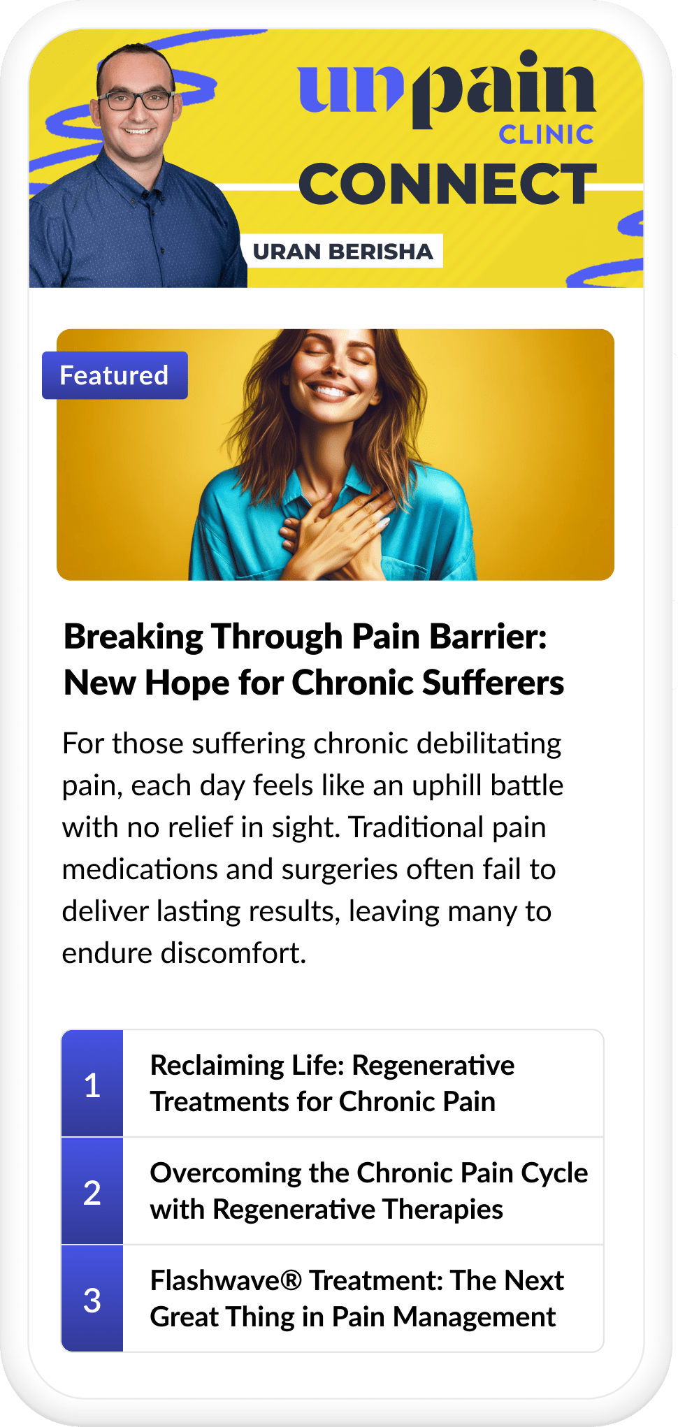 Subscribe to learn about Unpain Clinic's breakthroughs in specialized pain treatment featuring our regenerative solutions and patient success stories.